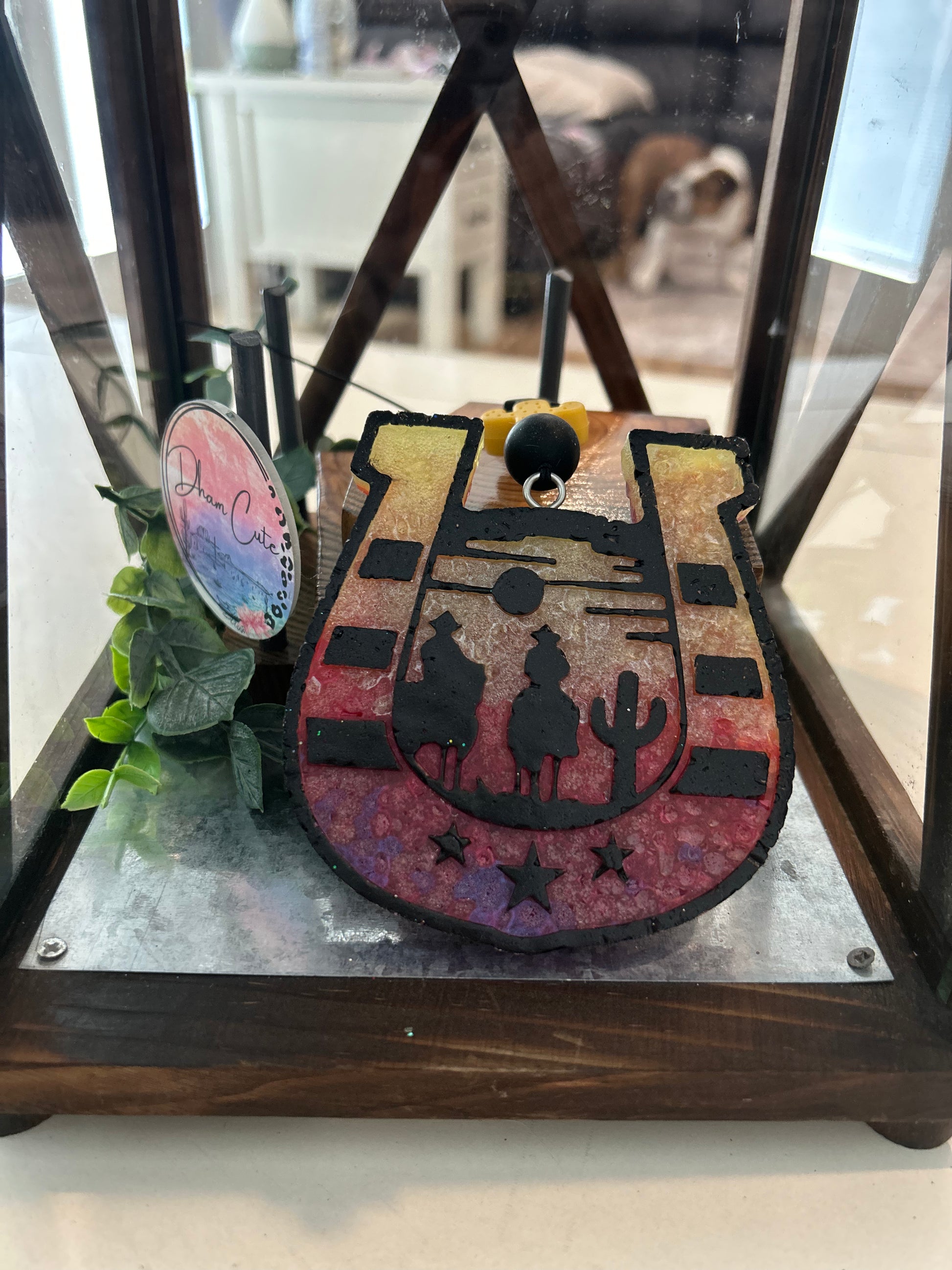 Add a touch of the wild west to your car with Cowboy Sunset air freshener. The horseshoe and desert scene design, along with the warm hues of the sunset, will transport you to the open range. Customize the scent and enjoy a refreshing and unique driving experience!