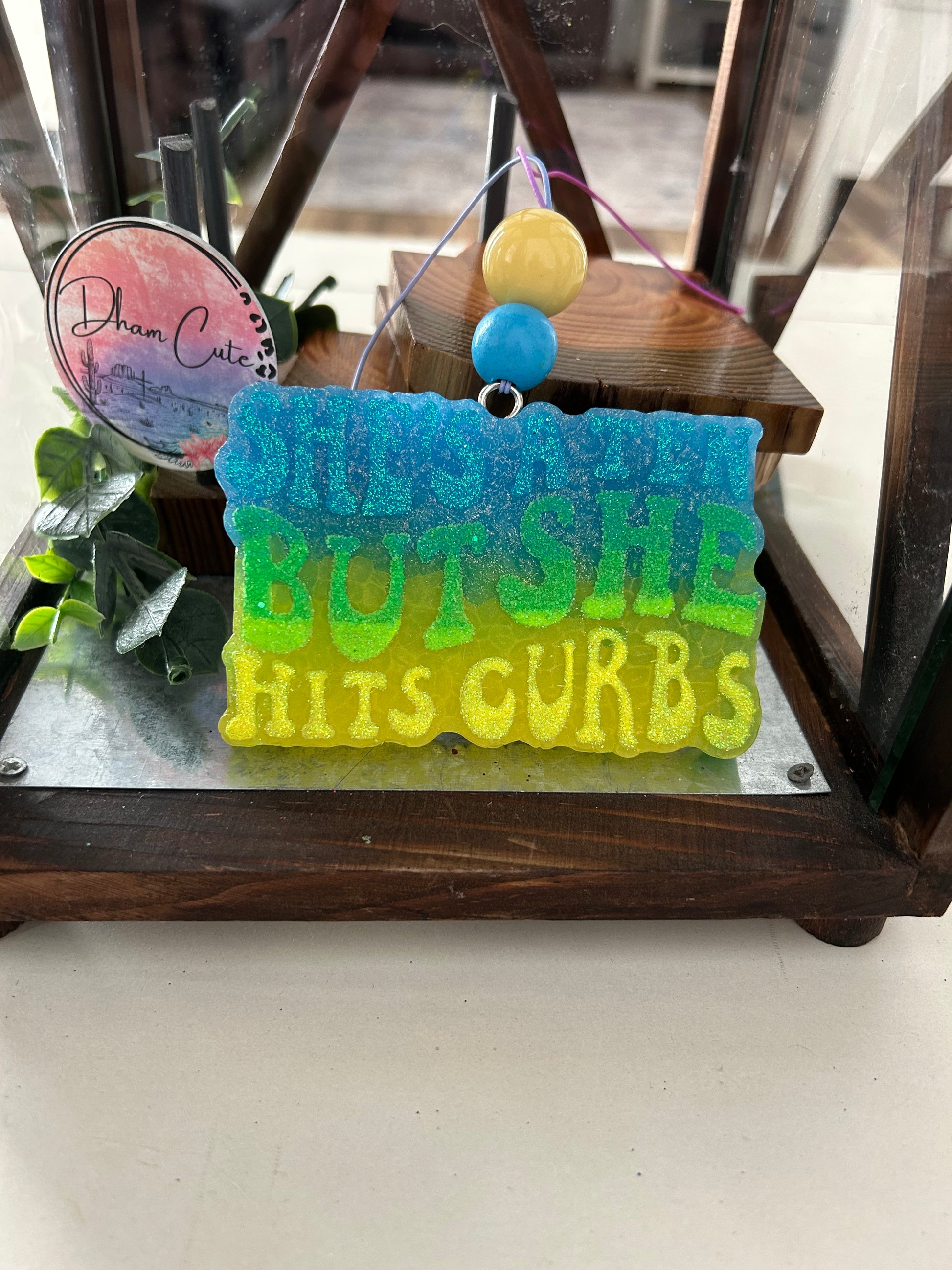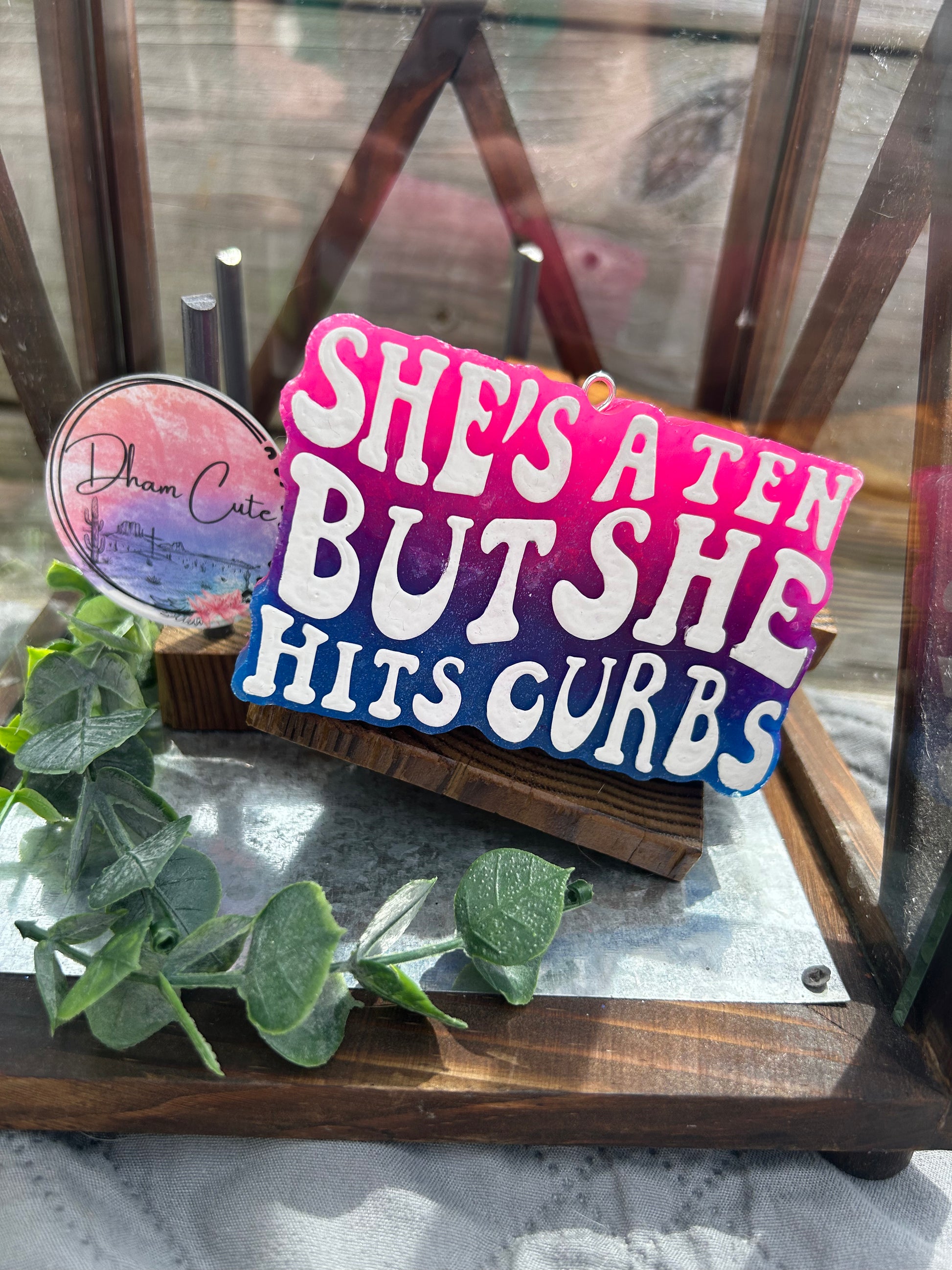 "Upgrade your car game with "She's a 10 but she hits curbs". This small space and car freshener will keep you feeling fresh and on point, even when your driving skills might not be. No more odors, just good vibes."